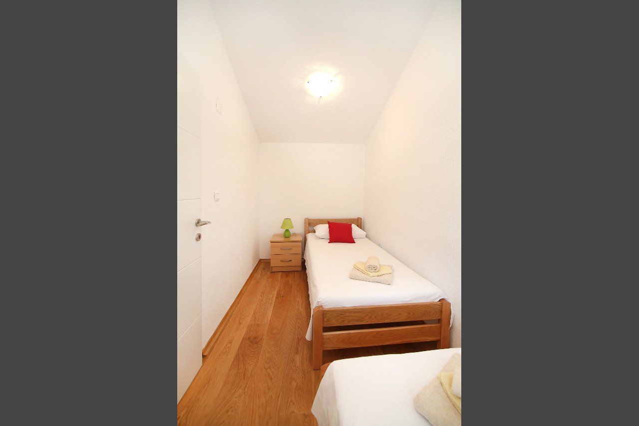 Na prvom katu nalaze se 2 spavaće sobe. Prva spavaća soba sadrži bračni krevet dimenzija 160x200cm s dodatnim pomoćnim krevetom i ormar. U drugoj sobi nalaze se 2 kreveta i pripadajući ormar.